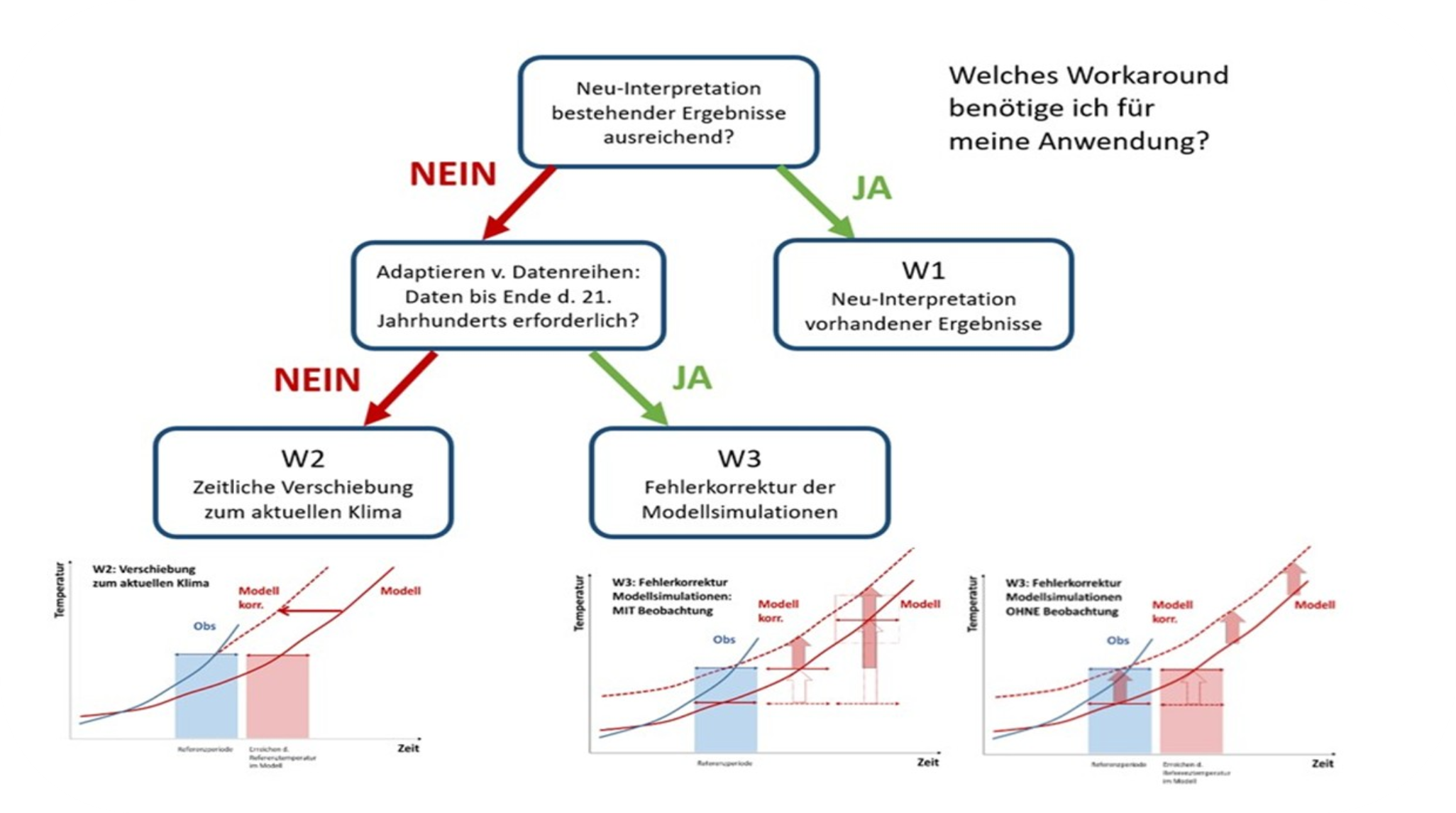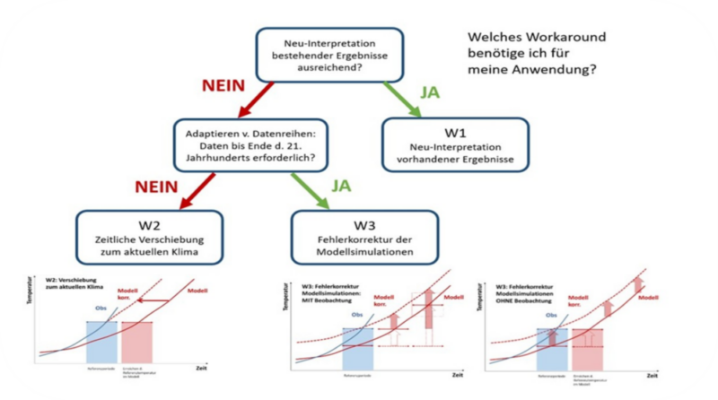 Die vorgeschlagenen Wege („Workarounds“) zur Reduzierung der Auswirkungen des unterschätzen Temperaturtrends orientieren sich an folgenden Fragen, die für jede Anwendung gesondert zu klären sind: