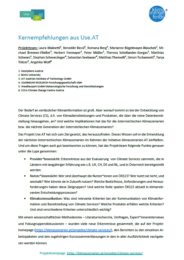 Use.AT is a research project funded by the Austrian Climate and Energy Fund as part of the ACRP fund-ing program. It aims at systematically harvest learnings from Austria’s current national climate scenar-ios, ÖKS15, and comparable international approaches. Thus, it contributes as an accompanying re-search project to the development of new Austrian climate scenarios as part of the Klimaszenarien.AT initiative (see www.klimaszenarien.at).