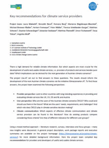 Im Use.AT Report WP2 „Make use of learnings from climate services in selected countries and AT“ werden vorrangig Lösungen für Climate Services aus Sicht der Service-Anbieter:innen behandelt. Executive Summaries dazu sind in deutscher und englischer Sprache erschienen.
